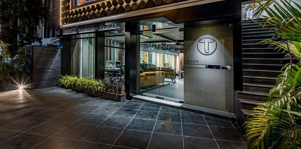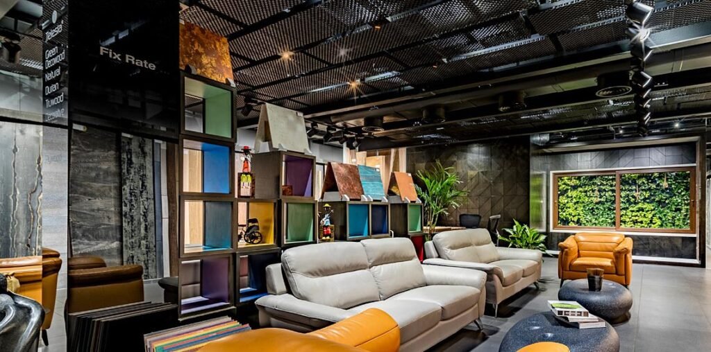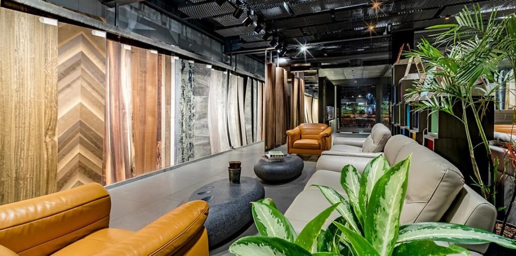 At Telesis, a landscaped outdoor sitting area garnished with natural materials welcomes the visitors and provides an exotic entrance threshold for the veneer studio.